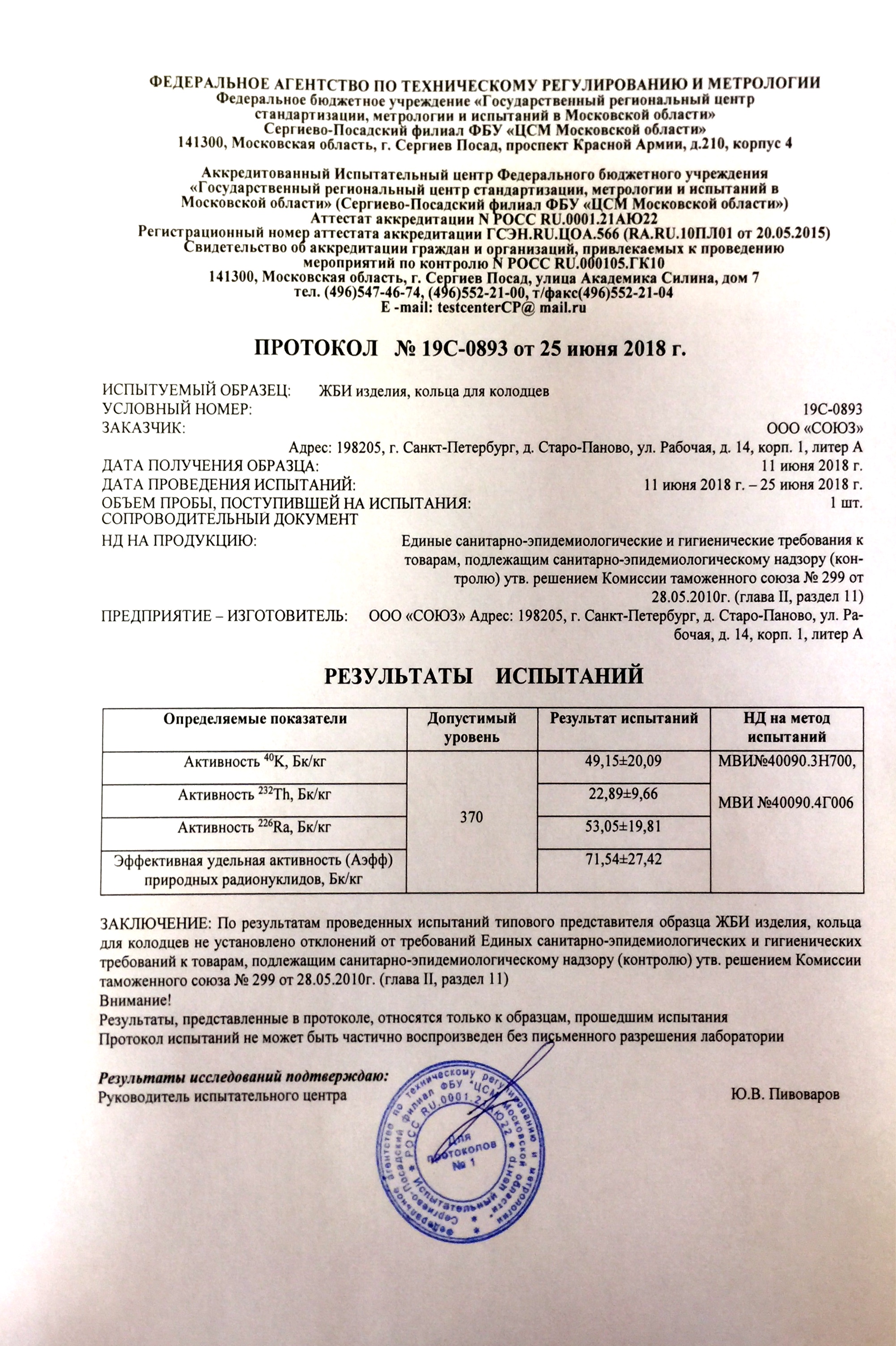 Результаты испытаний ЖБИ изделия, кольца для колодцев