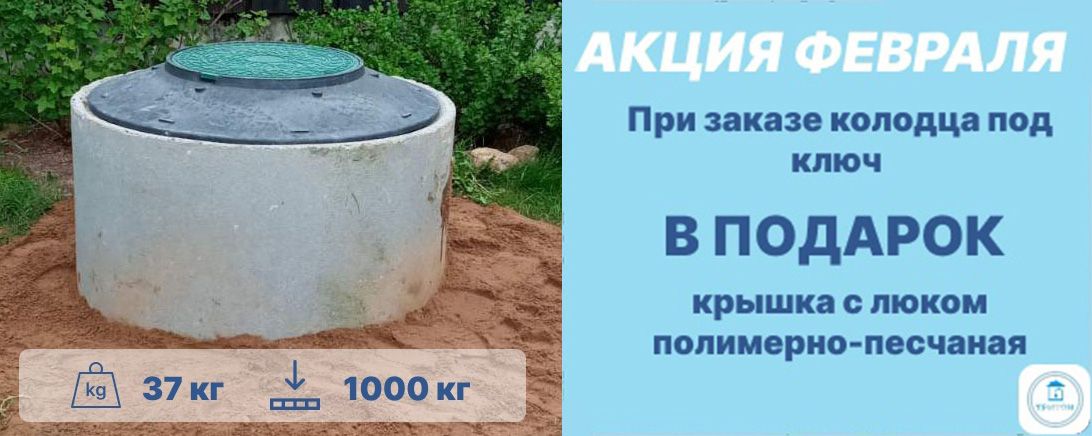 АКЦИИ АКЦИЯ ФЕВРАЛЯ При заказе колодца под ключ в подарок крышка с люком полимерно-песчаная. Сроки проведения акции 01.02.2023-28.02.2023. Не суммируется с другими акциями компании.